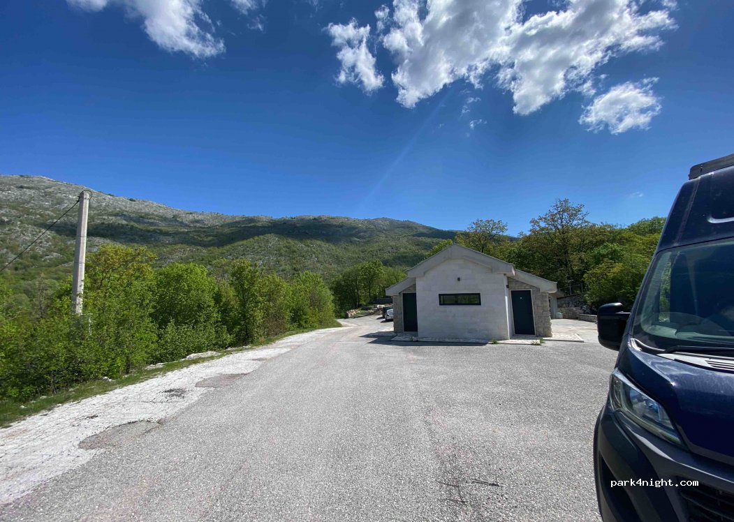 Parking à une petite chapelle et cimetière. Place de parking de plain-pied sur goudron neuf. La route pour y arriver est étroite, raide et un peu cahoteuse. Nous avons réussi mais lentement dans une camionnette de 6,5 m. Conduit prudemment.