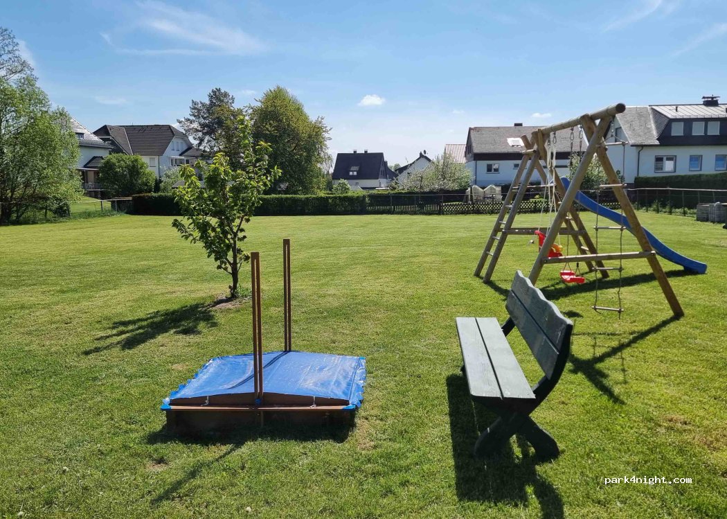 Stellplatz mit Schaukel, Sandkasten, Spielgeräten.