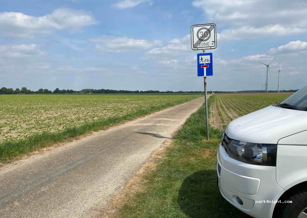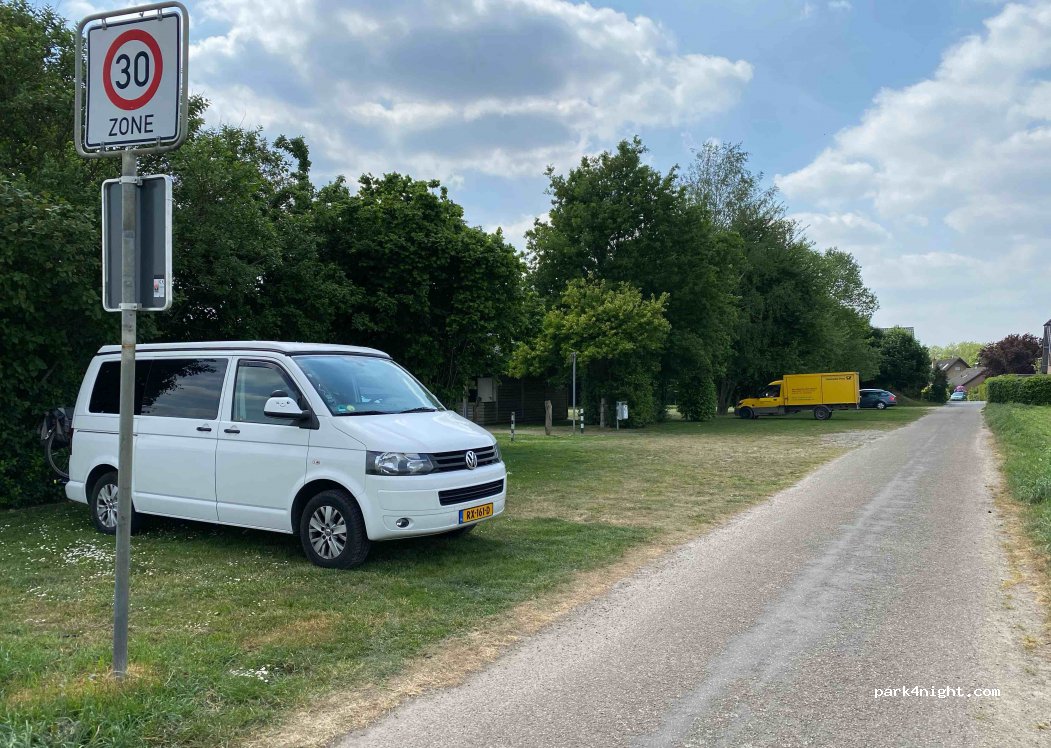 Kleine parkeerplaats naast een lig-/speelweide met meerdere bankjes. Achter het speelveld is ook een speeltuin. Het is zeer rustig gelegen aan de rand van het dorp. Prima uitgangspunt voor wandel- of fietstochten. Doodstil 's nachts; helaas begint de kerk om 6 uur weer....we werden wakker.