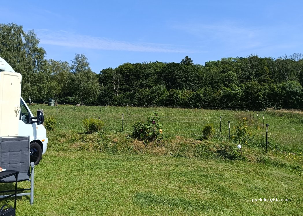 Wunderschöner Stellplatz, für einen Camper absolut geeignet. Umringt von Pferdekoppel, Hühnern, Kühen...sehr sympathische Gastgeber und frische Eier können auch direkt vor Ort gekauft werden. 15€ pro Nacht inklusive Strom. Absolut ruhig! 15min Fußweg bis zu einem kleinen aber schönen Strand. Absolut empfehlenswert!