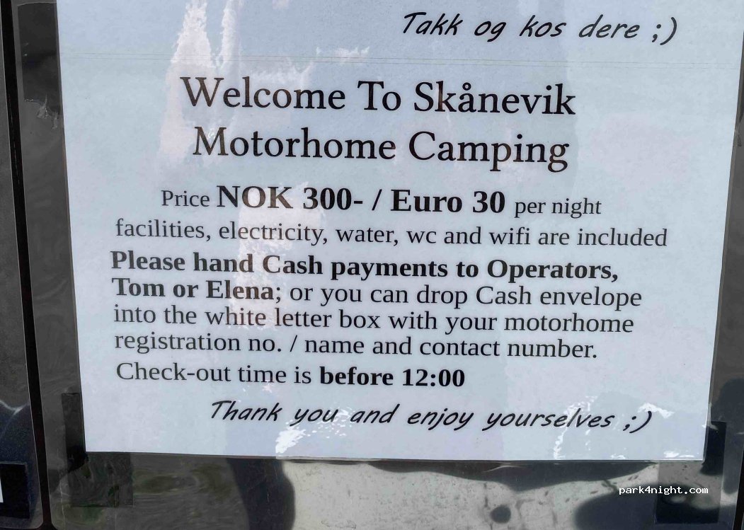 Sehr empfehlenswert! Wir standen hier 2 Nächte. Kaum waren wir auf dem Parkplatz stand direkt die Besitzerin neben uns und hat uns alles gezeigt und erklärt - sehr freundlich und alles ordentlich und sauber (auch die Toiletten/Dusche). Sie hat uns auch telefonisch einen Arzttermin organisiert und es war immer nett, sich mit ihr zu unterhalten. Bezahlung Bar in Euro oder NOK. Für die Dusche 10 NOK