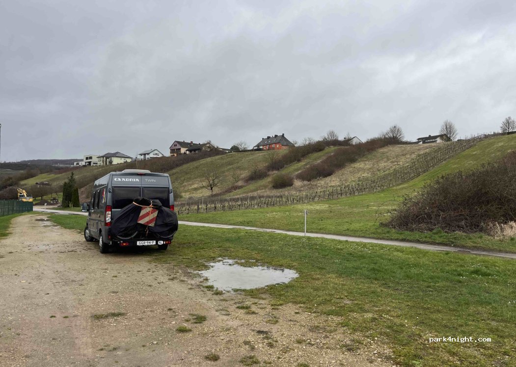 Wir standen hier eine Nacht mit schönem Blick auf die Weinberge. Der Platz ist asphaltiert. Ein paar Meter entfernt gibt es eine Straße/Spazierweg, den wir morgens für eine ruhige Gassirunde mit den Hunden nutzen konnten.