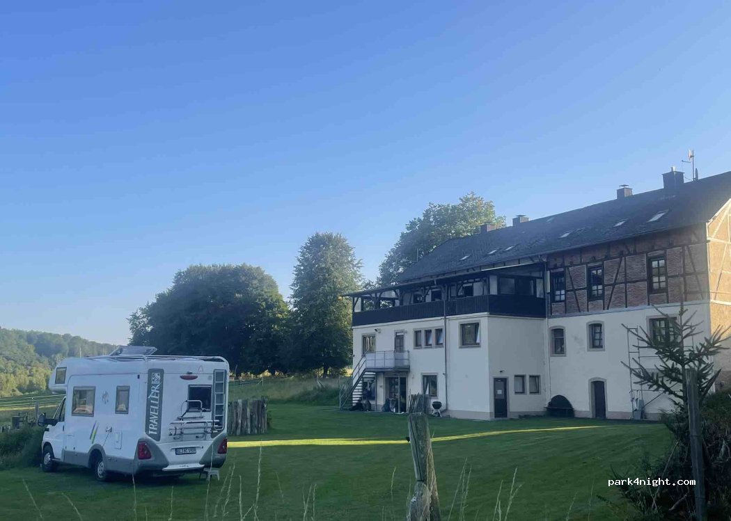 Place on the meadow. Not suitable for mobile homes over 6.50 m, max. 3.5 t. Surrounded by the Hunsrück-Hochwald National Park, you can enjoy the peace and quiet here. Maximum of 2 places with shower, toilet, washing facilities. Catering closed, fridge with drinks available. Cell phone reception only possible with Vodafone. WiFi available. Please call for availability.