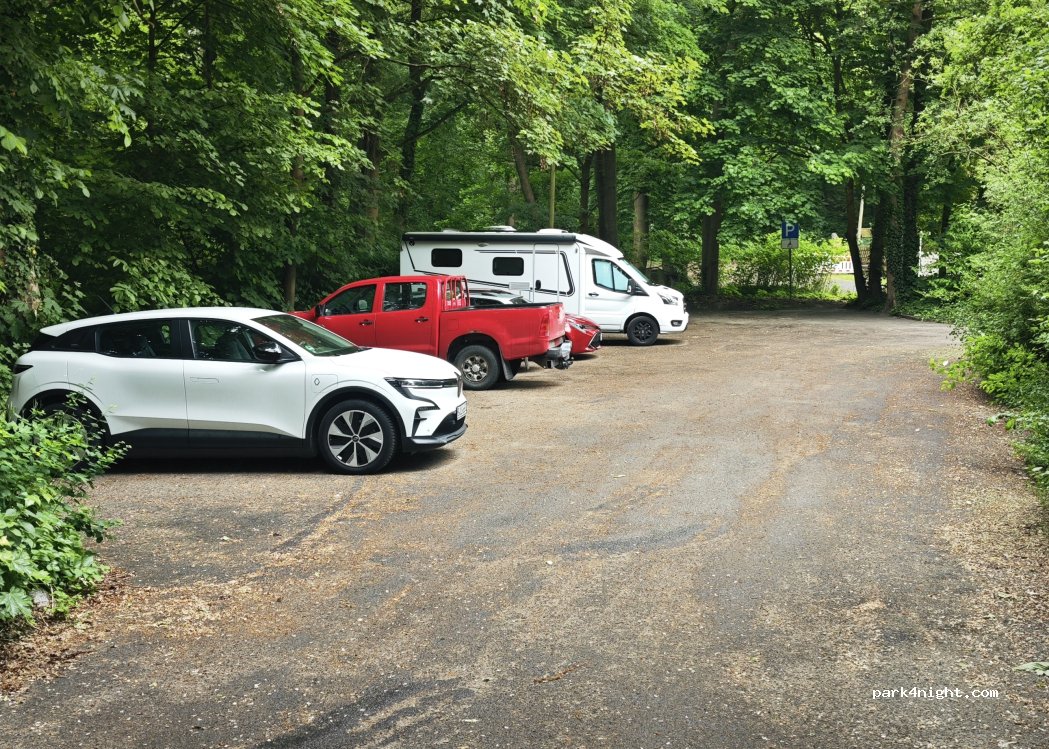 Parkplatz ohne Kennzeichnung, keine Verbotsschilder. Wunderschöner Naturpark. Und See in kurzer Laufweite. Schattig, sauber, eben auf Erdboden.