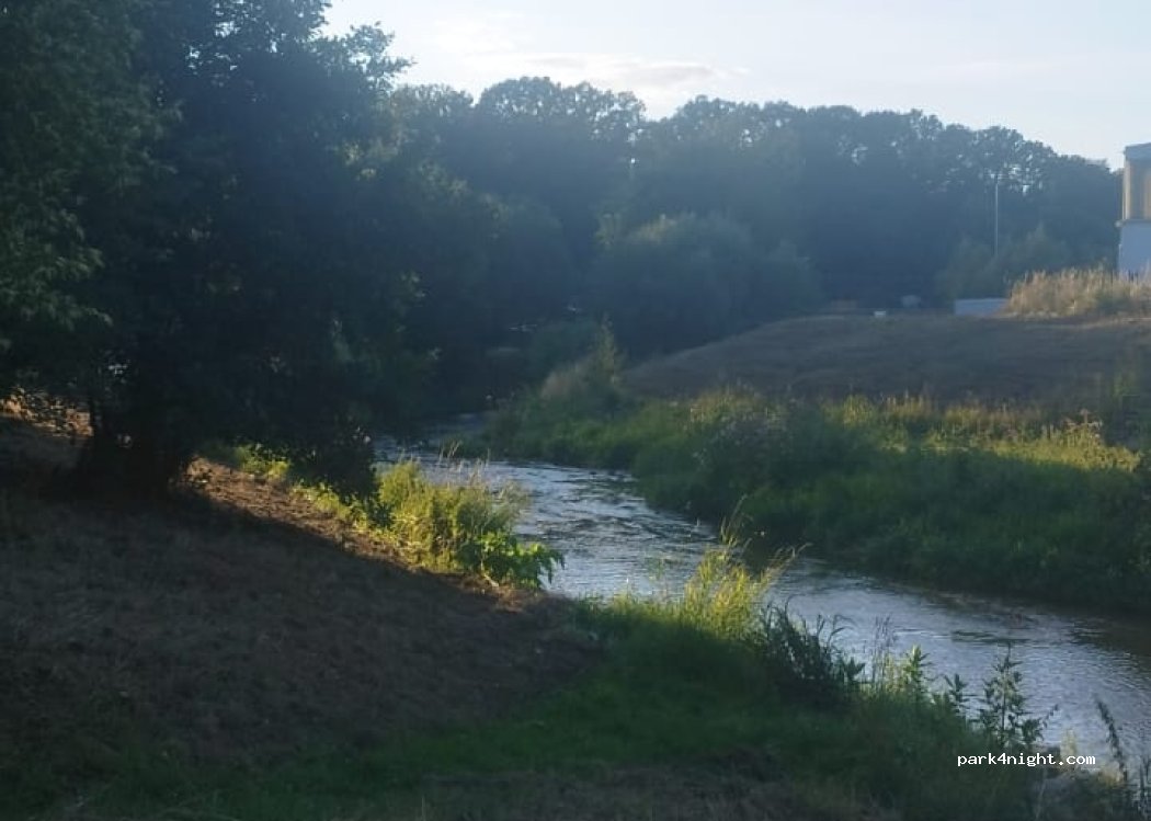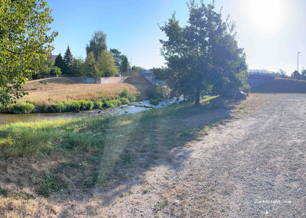 Hikers' car park by the Pleiße river. Right on the water, beautifully situated. No traffic at night.