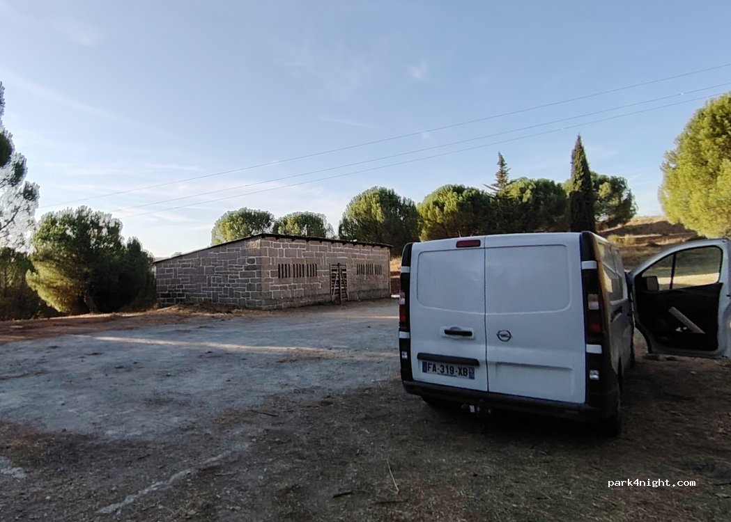sitio muy tranquilo, mucha sombra, la carretera no tiene apenas trafico por la noche. probamos a dormir en otros spot pero tenian durlo empedrado y nos da a miedo el ruido si pasaba algun coche. dormir aqui fue un acierto. dormimos solos.