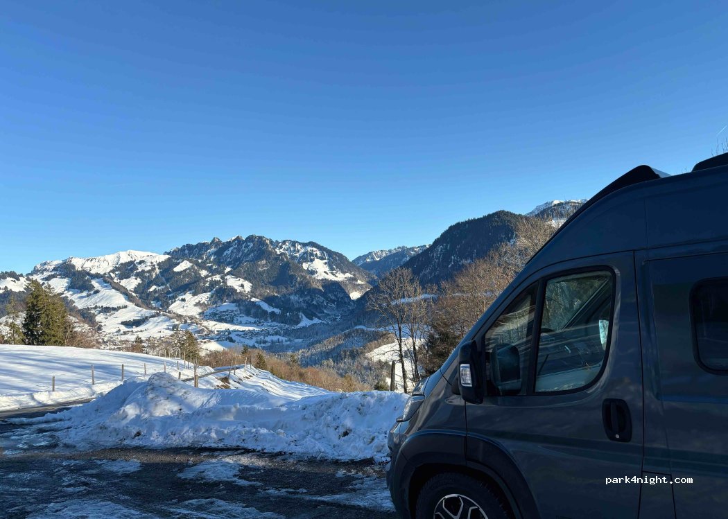 Super spot, très calme pour y passer la nuit. Jolie vue sur les montagnes et un petit village en contre bat. Juste à côté d'un chemin de départ de rando. Endroit très prisé donc il ne faut pas y arriver tard si vous voulez avoir de la place.