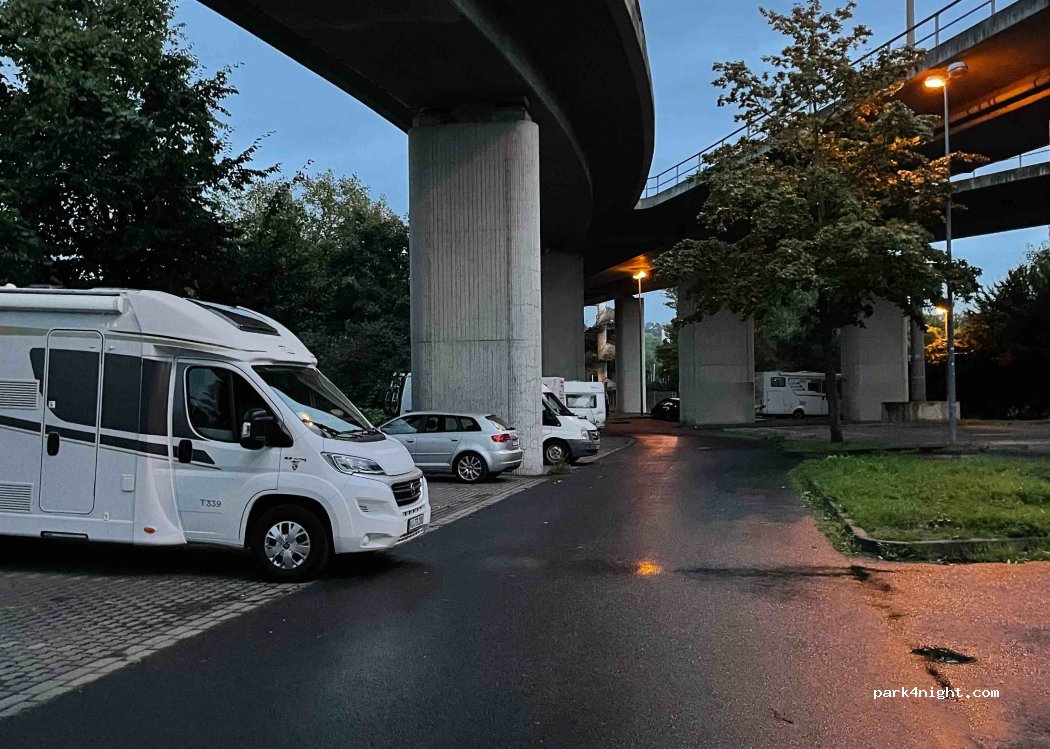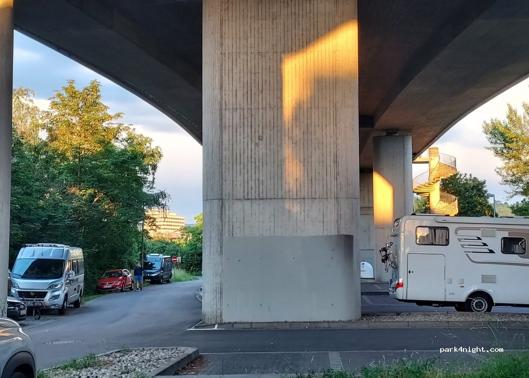 Großer Parkplatz unter der Brücke , nachts trotzdem sehr ruhig . Direkt an der Mosel . ca 100m entfernt tolle riesige chillige Strandbar mit Cocktails und tollem Essen. Kinder konnten im Sand buddeln , und wir die Sonne genießen