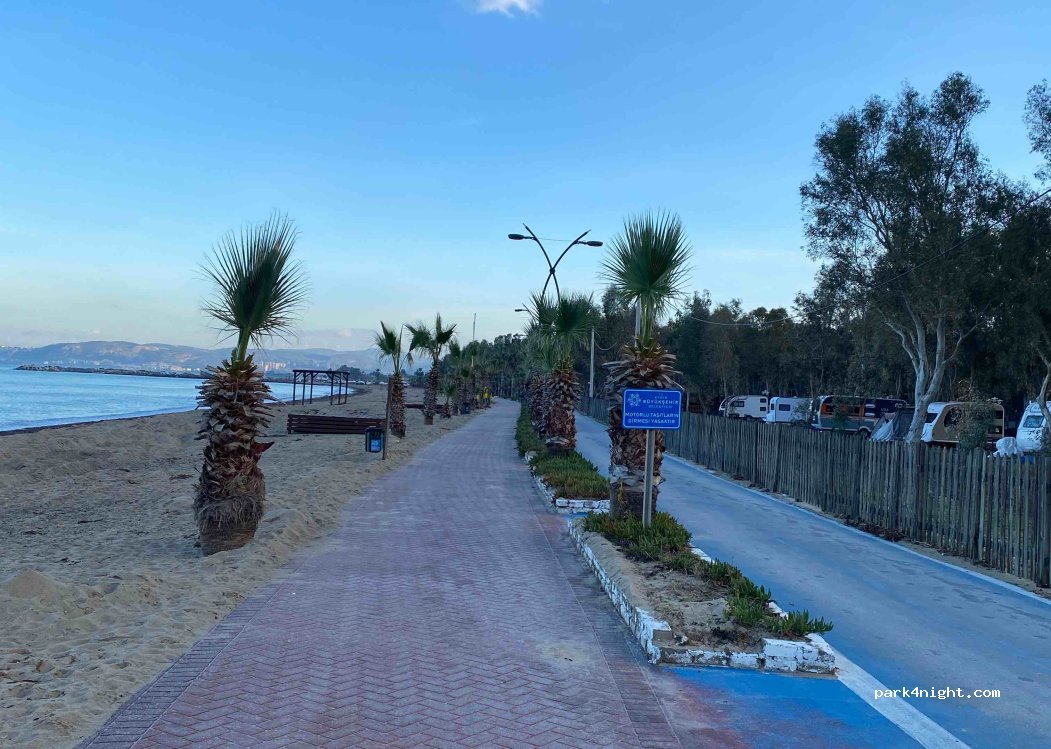 Just next to the beach. 24 hour security. Market shops inside. Also a pide restorant. Clean. Operated by the local city hall. Without reservetion not possible to stay.