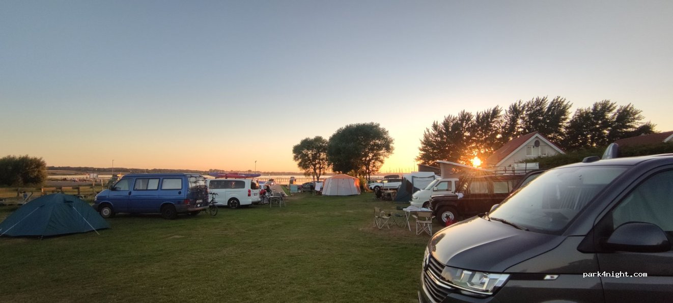 Unmittelbar am Wasser gelegen, schöner (Hunde-) Spaziergang mit Blick auf die Bucht und Segelboote, Hundestrand und Wäldchen in der Nähe. Sauber, freundlich und fast vollautomatischer Checkin / Checkout. 33 € für 2 Personen, Autostellplatz, Hund.