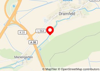Nahe der A38 an einem Sportplatz, etwas ausserhalb des Dorfes. An einem Bach mit Brücke gelegen.