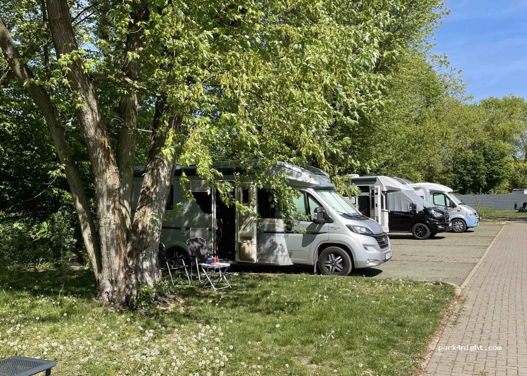 Cette aire est agréable car pour 10€ vous êtes à 5 mn d'Edeka et à 10 mn du centre ville. Seul problème l'agent municipal m'a demandé de partir le lendemain mon arrivée car selon lui la remorque pour scooter était interdite. Or aucun panneau ne signale cette interdiction ! Donc 2 étoiles seulement !