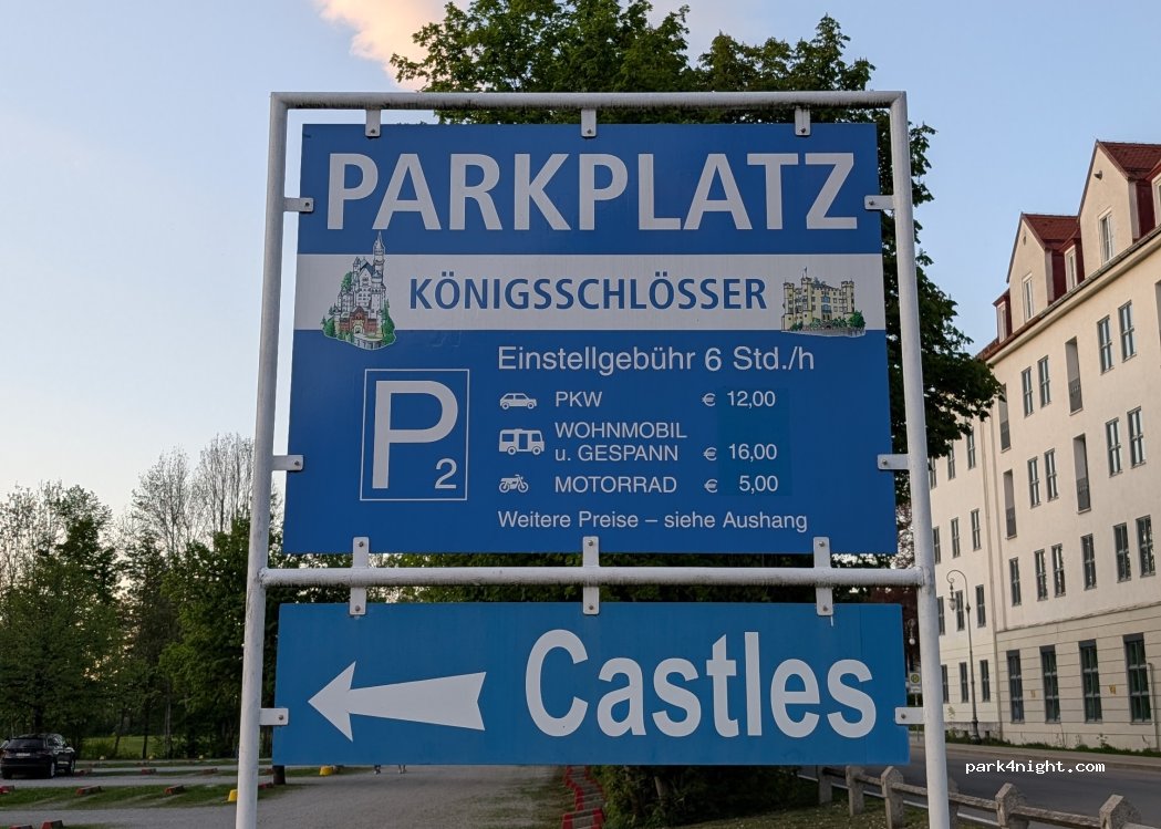 Wohnmobilparkplatz für 13€ (8 Stunden) . Bezahlung mit Karte möglich (nicht an allen Kassen, nur an eine kleinere Kasse auf der Seite der Hütte). Das Schloss Neuschwanstein und Hohenschwangau sind ideal zu erreichen.