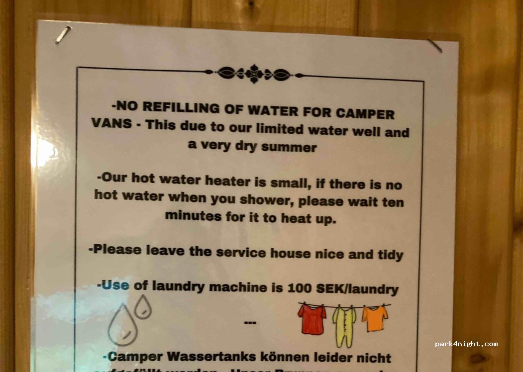 Fijne plek om rustig te staan. in de nacht heel stil. Sanitair is schoon. af en toe wachten op warm water ivm beperkte capaciteit van de boiler. Er zijn konijnen die je mag aaien. Kano te huur voor een dag 300 SEK. En er zijn groenten te koop uit de moestuin. zeer vriendelijke eigenaren.