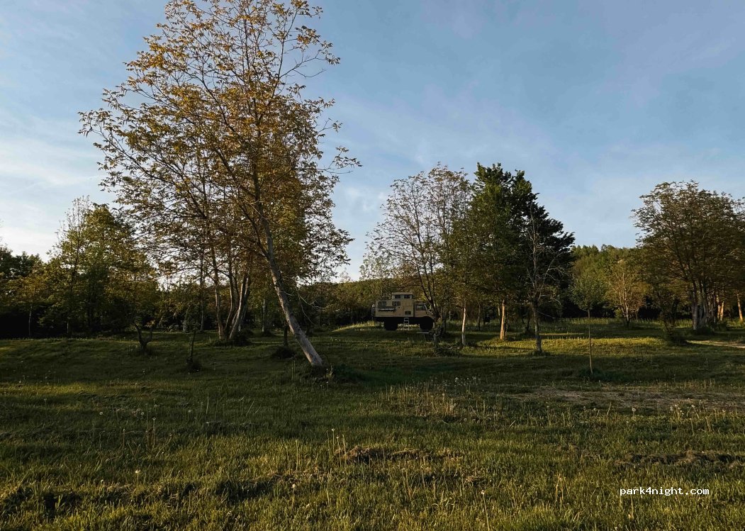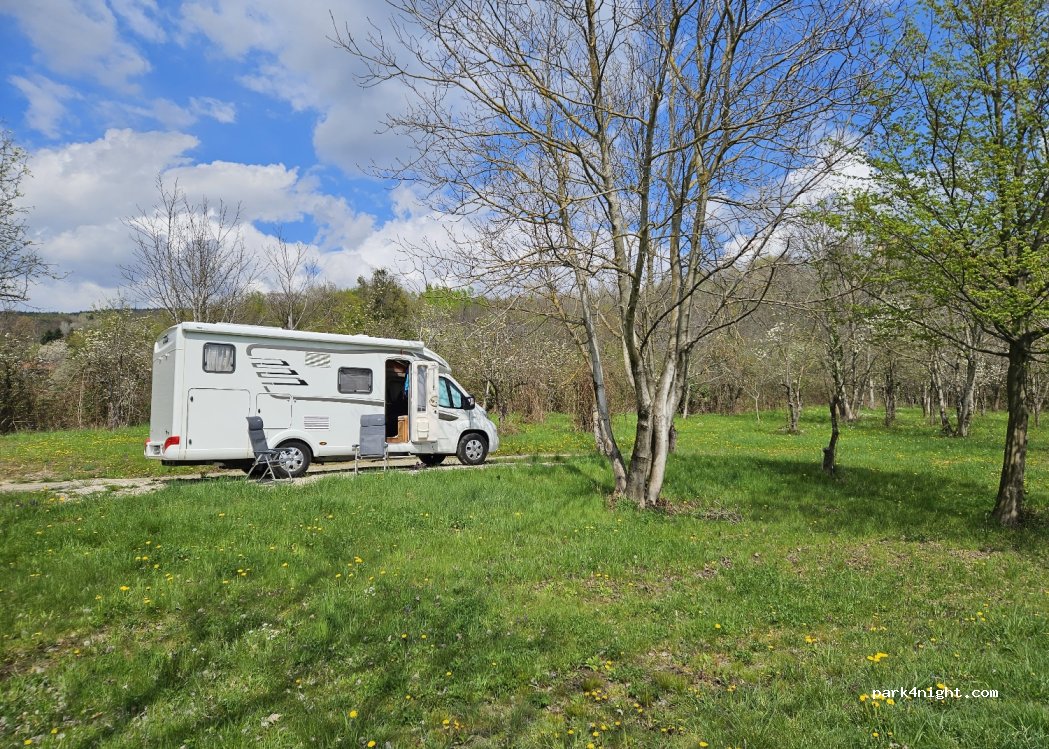 A rustic, gorgeous stopover. The family are so warm and friendly (excellent English which was amazing for us). They make ciders, grape juices, wines and bread - and serve a serving simple ‘bread and something’ platter-based menu which was lush! The beans were soo good!! We stayed - just us… bliss! - in their quiet orchard: flat pitches, electric, water tap - basin and WC open 24hrs. Recommended.
