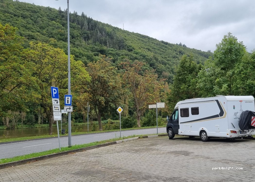 Schlichter Stellplatz auf einem größeren Parkplatz. Zwischen der Mosel und dem Stellplatz verläuft allerdings - trennend - die Hauptstraße, so dass dies das größte Manko des Stellplatzes im Vergleich mit anderen darstellt. Die laute Bahnstrecke direkt hinter dem Stellplatz fällt da kaum noch ins Gewicht. 5€ pro Tag.