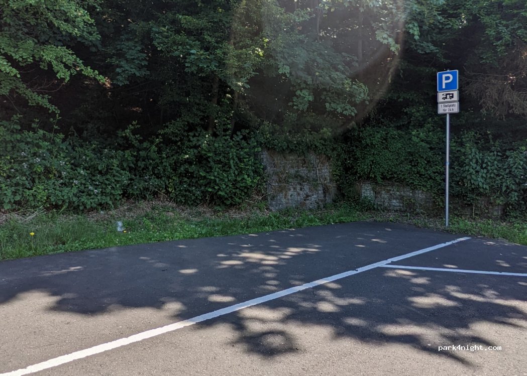 1 kostenloser Stellplatz für Wohnmobile für 24h auf einem Parkplatz. Leider ist er schräg, aber für eine Nacht völlig in Ordnung