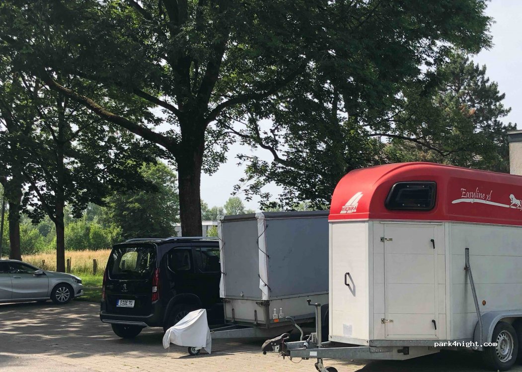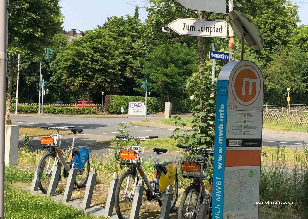 Shaded parking lot on the Ruhr, rental bike station on site, bus stop, restaurant with outdoor dining within walking distance. The "Hahnen ferry" pier of the White Fleet Mülheim is also on site