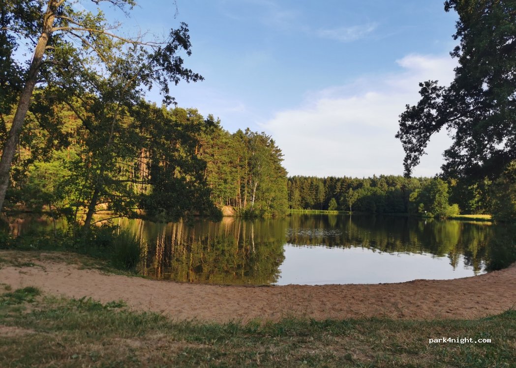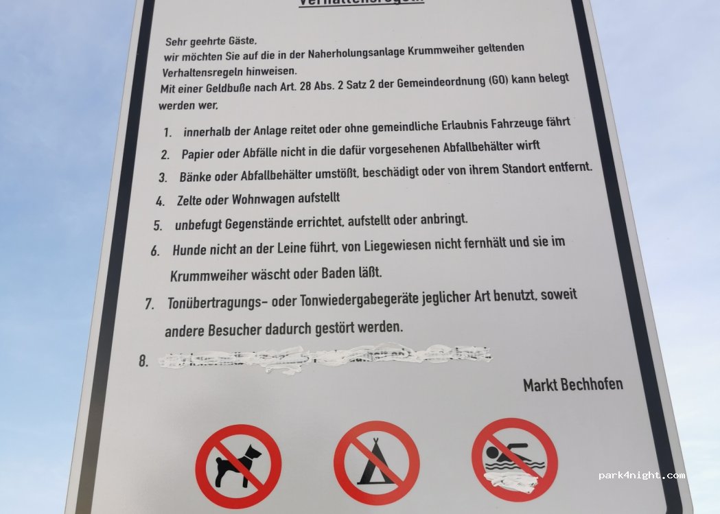 Parking at Krummweiher. There are 2 parking spaces. A large one at the front of the kiosk and a small quiet parking lot. The main car park can be reached via Krummweiherstr. To the quiet small parking lot across the street Am Brechhaus. The lake has absolute bathing quality, kiosk, showers, free WiFi (near kiosk), water can be filled in the outdoor showers. There is a sign saying no camping or caravan parking. We were standing there with a VW bus (inconspicuous) I think there are difficulties in staying overnight with larger motorhomes.