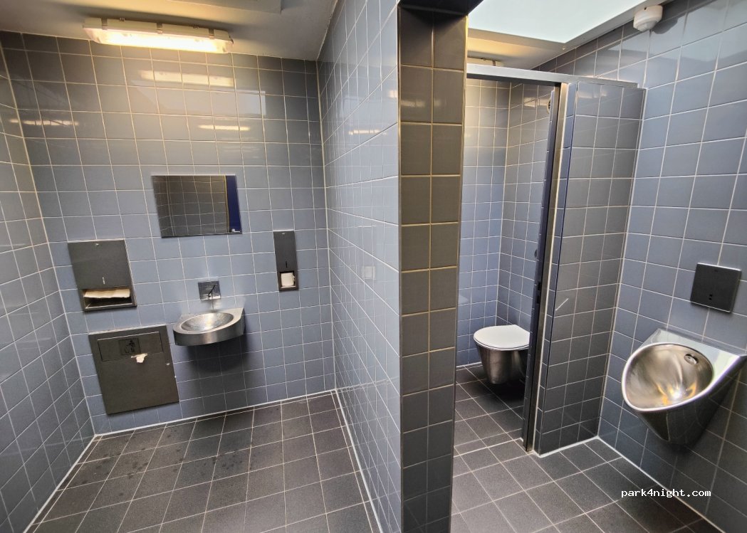 A parking lot at the artificial lake dam. Motorhome parking allowed by sign. Ok public toilets