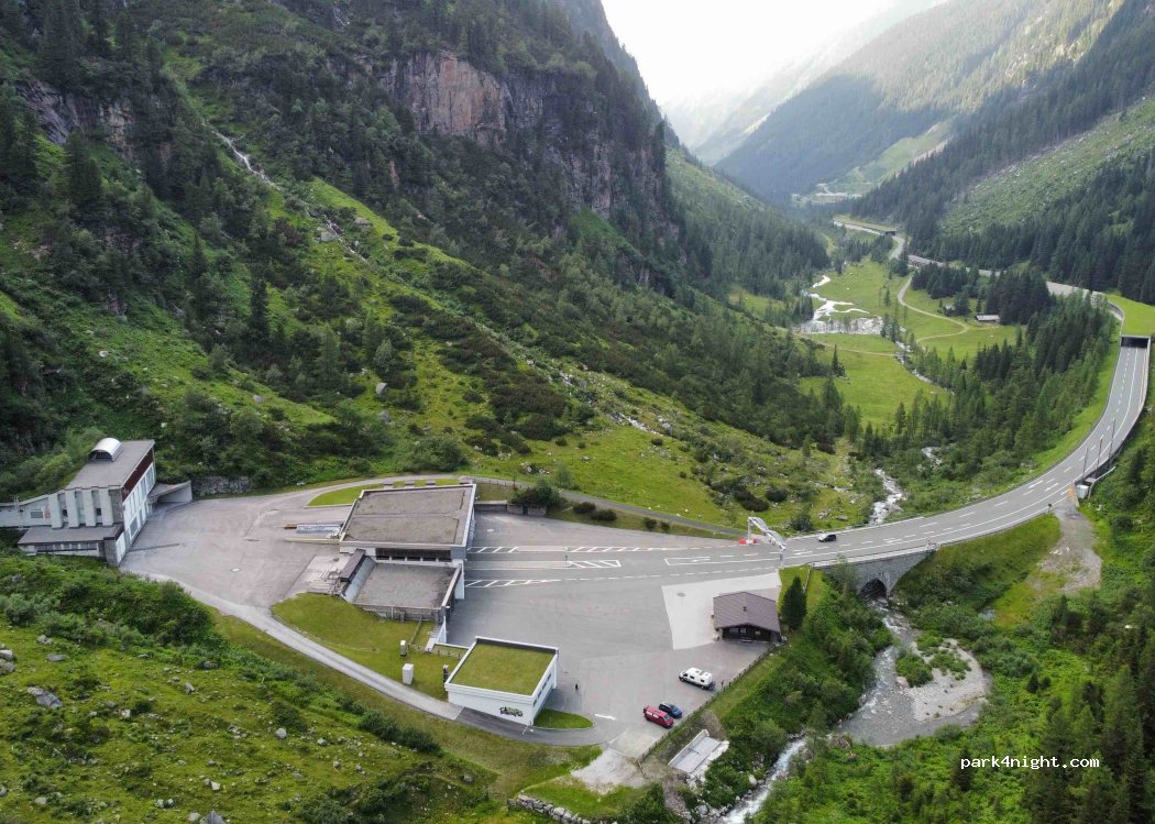 Großer, asphaltierter, ebener Parkplatz vor der Einfahrt zum Felbertauerntunnel. Öffentliche Toiletten sind vorhanden. Parken über Nacht problemlos und kostenlos möglich.