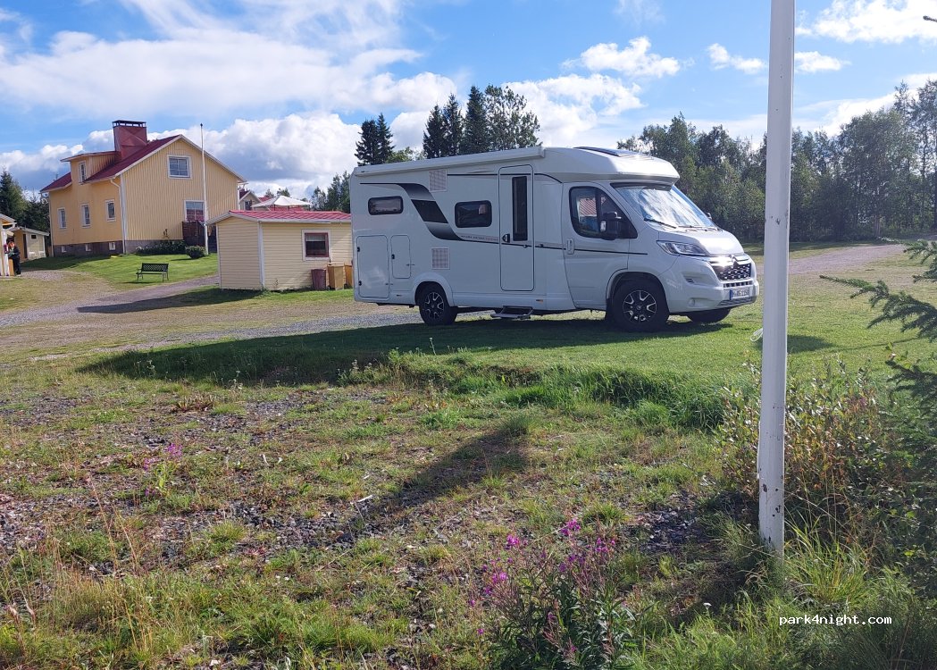 Privater, offener Stell- und Campingplatz im Rasen. Ca. 15 Stellplätze 200 SKR, Stromanschluss 50 SKR. 10 Zeltplätze 200 SKR, 7 Hütten alle mit kochgelegenheit und 4 mit WC 500 SKR. 2 Servicehütten die in die Jahre gekommen, aber sehr sauber gepflegt sind. Es kann auch mit Euro bezahlt werden. Tische und Liegestühle aufstellen erlaubt. Ruhige Hunde erlaubt. Wasser mit Schlauch vorhanden. Chemieentsorgung mit Trichter am Servivehaus. Abwaschtrog am Servicehaus im freien. Ca. 200 M. von der E45 und des Zollübergangs Schweden-Finnland entfernt. Nachts sehr ruhig. Adresse: Olaus Sirmas gata 15, Karesuando. Tel.: 46 70 214 51 67