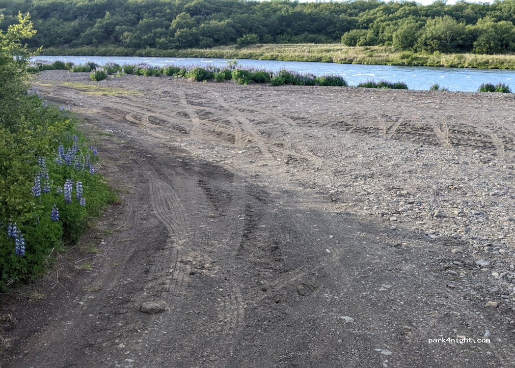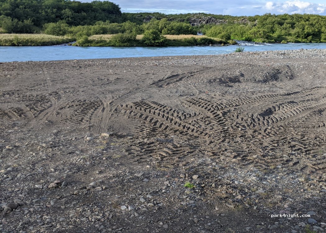 Ideal pour passer la nuit en camping car près de la rivière a l écart de la route. Bien rester sur la partie cailloux pour éviter d être bloquer dans le sable noir.