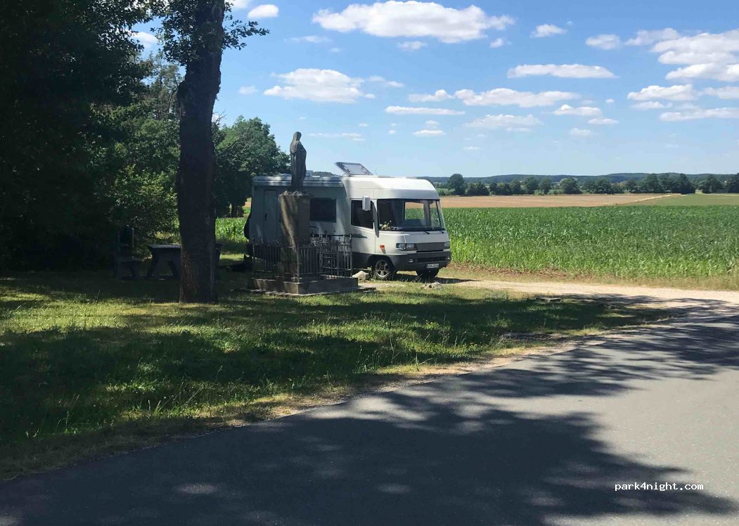 Schöner Platz mit Blick auf Felder und Sonnenuntergang, direkt an der Straße, habe hier aber sogar die Nacht verbracht. Es war Montagabend und so ab 20 Uhr nur noch sehr wenige Autos, nachts total ruhig, ab früh morgens vereinzelt, so dass man schon relativ früh wach wird. Aber passt, würd ich wieder machen.
