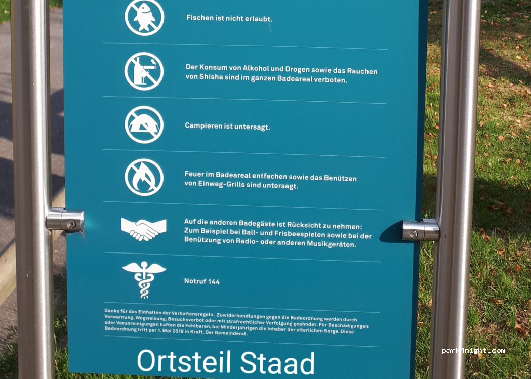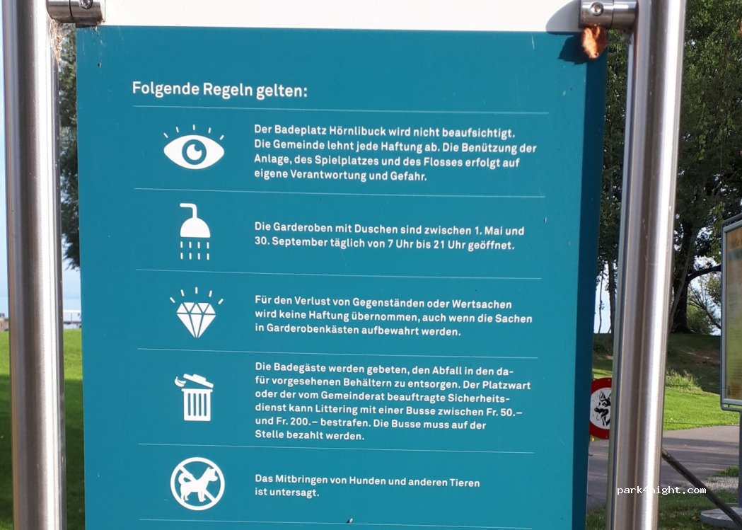 Der Platz heißt Badeplatz Hörnlibuck der Gemeinde Staad, Ortsteil von Rorschach und kostet von 7.00 bis 19.00 pro Stunde 1 Sfr., mind. 2 Std. für 2 Sfr. Von 19.00 bis 7.00 Uhr kostenlos, siehe Aushang Parkuhr. Die Umkleiden mit Toiletten und Duschen sind vom 01.05. bis 30.09. geöffnet von 7.00 bis 21.00 Uhr, siehe "Folgende Regeln gelten". Es ist eine sehr gepflegte, saubere Anlage.