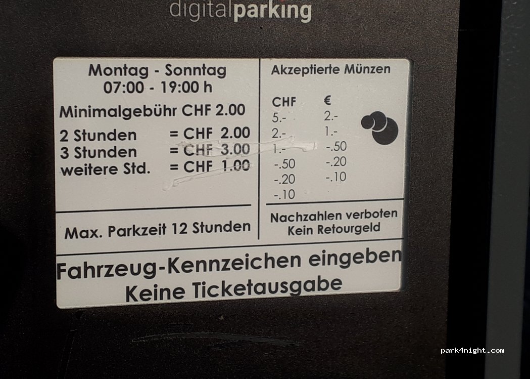 Parking en bord de route et chemin de fer. 18 CHF les 12h même la nuit. Plus calme entre minuit et 5h30 (pas de trains et moins de trafic). Bon dépannage quand on est trop fatigué pour conduire plus loin. Toilettes et douches très propres ouvertes à partir de 8h.