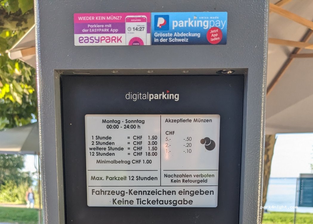 Es war schön auf diesem Parkplatz, wir haben gut übernachtet, Duschen und WC sehr sauber. Man muss jetzt rund um die Uhr bezahlen und darf höchstens 12 Std. auf dem Platz stehen, kostet 18 Fr.