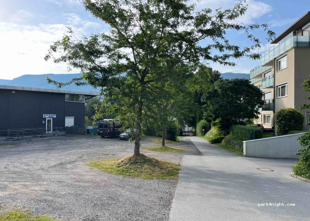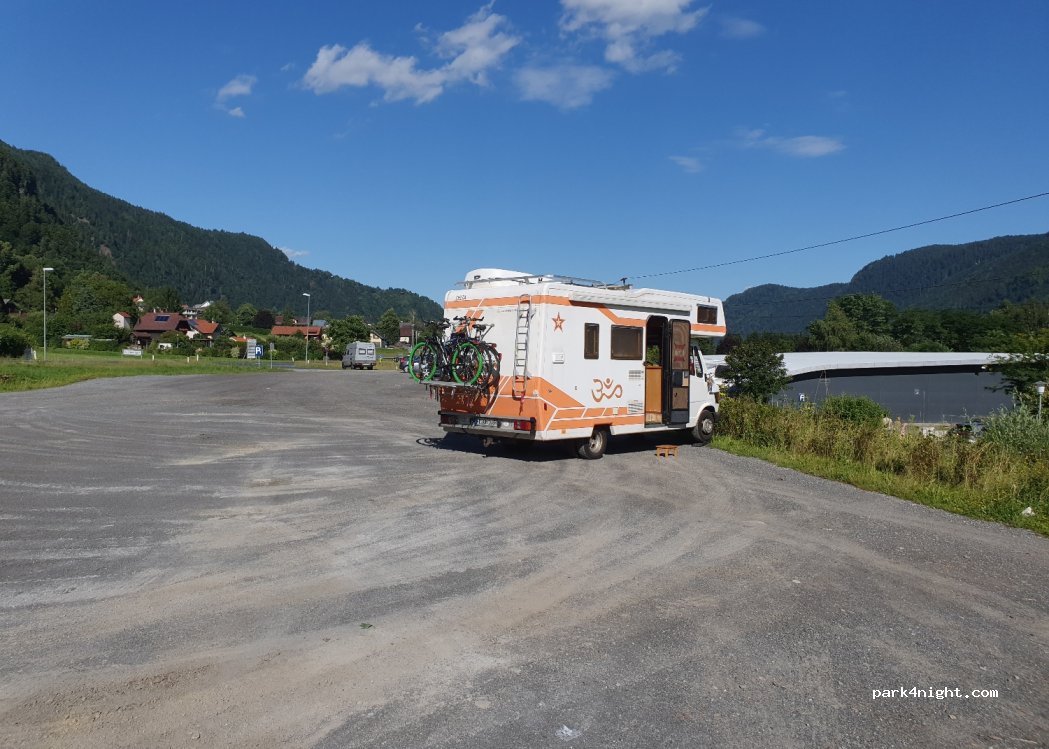 petit parking ,le long de la patinoire,très tranquille,ont s'y sent en sécurité. passe une très bonne nuit,nous etions 4 vans. Le lac est a300m. une petite ligne de chemin de fer passe devant le parking,trafic quasi nul. je recommande.