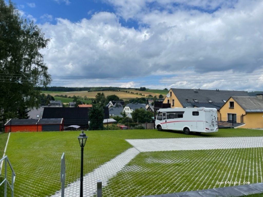 Platz ist neu und sauber. Allerdings kleiner als es auf dem Foto wirkt. Eigentlich ein 6mtr Platz! Wenn voll hat man mit einem längeren WOMO so seine Probleme. Platzpreis ist ok, aber die Nebenkosten sind űber zogen. Im Ort ist nicht viel los, aber Freunde der Bimmelbahn nach Oberwiesenthal und evtl. weiter zum Fichtelberg stehen dort ganz gut. Achtung, nicht eben! Keile erforderlich.