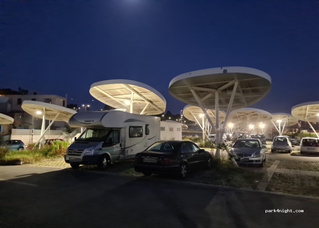 Ampio parcheggio asfaltato gratuito, all’ombra di pannelli fotovoltaici. Nessun problema neanche per l’altezza. Molto comodo per visitare il museo archeologico e per passeggiare sul lungomare