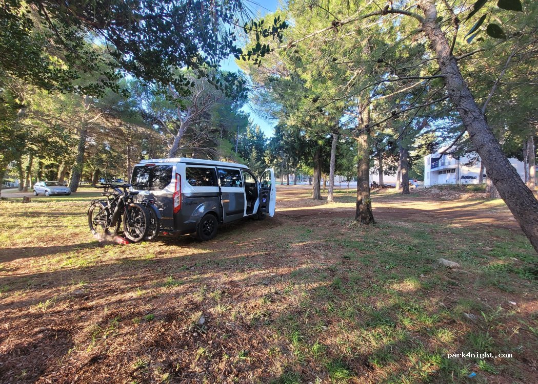 Parking under trees in the center next to a football field. Had a very quiet night, from 11:00 no one was there. Restaurant, s right next to it, the beach can be reached via stairs, shower available on the beach.