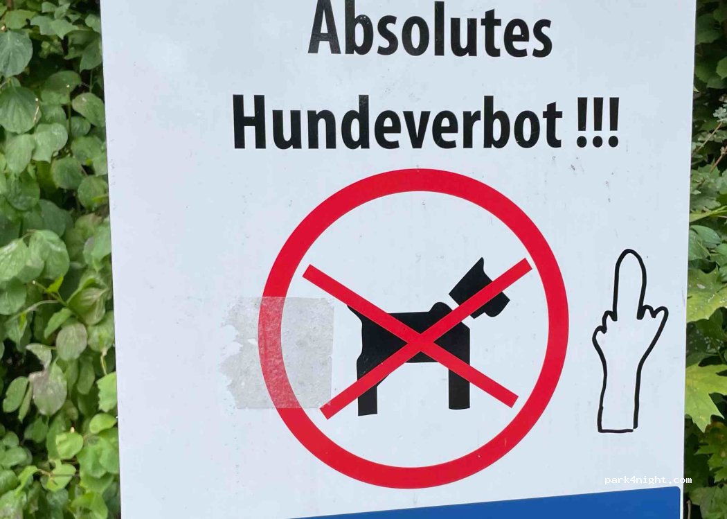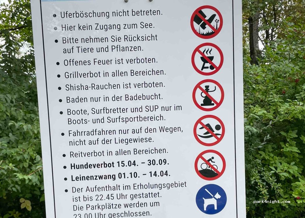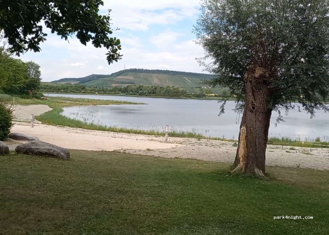 Parking at the lake with meadow, sandy beach and park, but only during the day. It closes at 11 p.m. Swimming has not been allowed here for some time, so it is very quiet for a relaxing day. Dumpsters in the park.