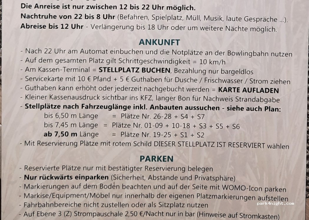 Die Anreise ist ab 12 Uhr bis 22 Uhr möglich. Während der Nachtruhe von 22 bis 8 Uhr stehen 4 ausgewiesene Notstellplätze zur Verfügung.