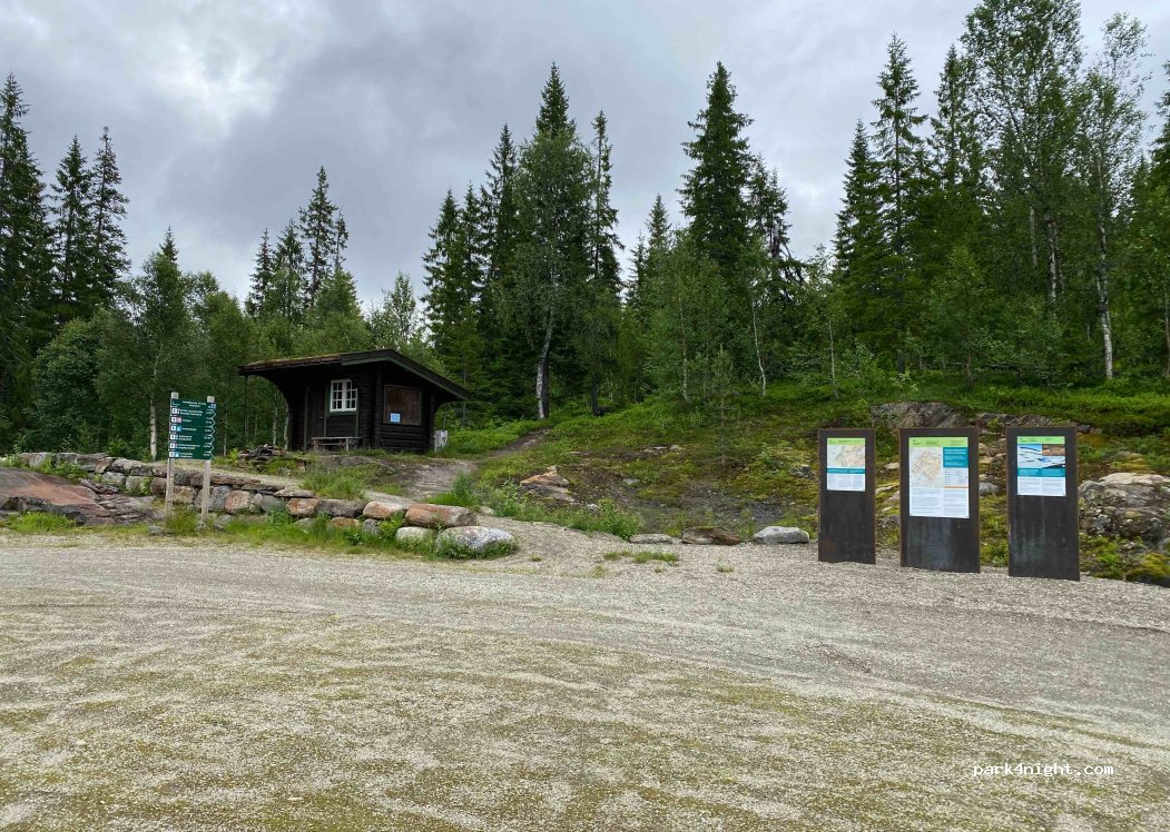 Zufahrt zum Wanderparkplatz erfolgt über eine kleine mautpflichtige Mautpiste. Ein Auto kostet 70NOK per VIPPS, zahlt man über die Internetseite per Visa, kommen noch einmal 20NOK Servicegebühr oben drauf. Wir haben hier eine ruhige Nacht verbracht, ein paar Mal haben wir den Zug gehört. Vor Ort ein Klo und eine verschlossene Wanderhütte.
