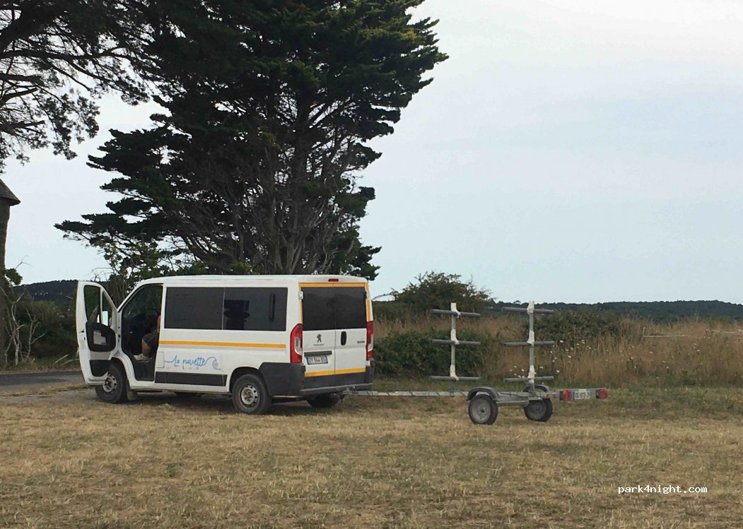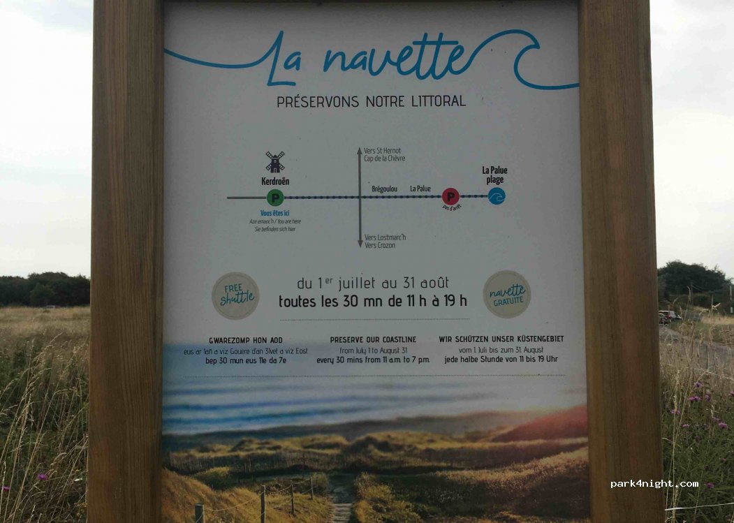 Perfect parking spot to go surfing at La Palue. Parking between 6am and 23pm (no camping). Free shuttle service to the beach of La Palue (every 30 minutes from 11am to 7pm in July and August) WITH surfboards. Respect the locals and support this effort of the community to decrease traffic trough the tiny village. Bonus: the shuttle (Navette) takes you and your boards all the way down to the beach!