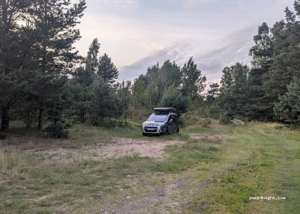En medio de un antiguo sitio militar, donde ya no hay edificios, puedes pararte y aparcar oficialmente. En todo el bosque aquí! ¡Preguntamos a varios lugareños! es muy bonito aquí, muchos prados entre los pinos. Más hacia el Mar Báltico es más húmedo. Fuera de la carretera, porque los caminos son muy arenosos y tienen grandes agujeros. Pero como en todas partes, los lugareños manejan aquí con cualquier vehículo. ¡Llévate tu basura contigo!