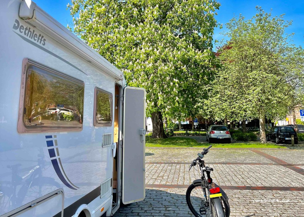 Stellplatz für eine Nacht schon ok. Kirchturmuhr ist zwar von 22-6Uhr aus, aber wegen des Kopfsteinpflasters rundherum hört man die fahrenden Autos doch recht laut. Griech. und Kroat. Restaurant hatten Anfang August leider beide zeitgleich Urlaub.