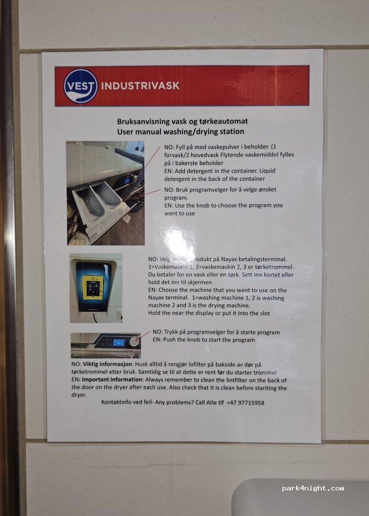 Schöner Stellplatz am Hafen. Strom vorhanden. WC/Duschen ordentlich und sauber. Code für die Tür gibt es bei der Bezahlung von EasyPark. Waschmaschinen sind auch dort vorhanden. Preis ist jetzt 316 NOK/24h.