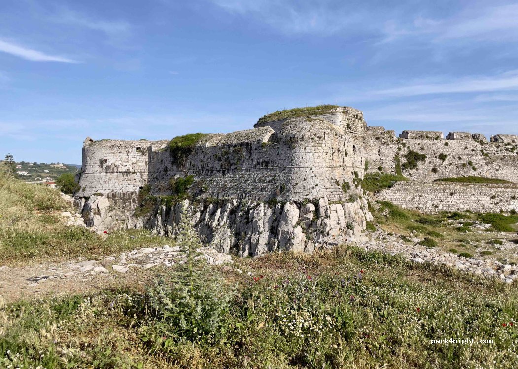 pratique pour visiter le château et le fort turque à ne pas manquer mais un camping qui demande à avoir un rafraîchissement côté sanitaires et l'entretien du terrain dommage car très bon accueil et une taverne sympa où on mange bien pour un prix raisonnable, plage et village très proche