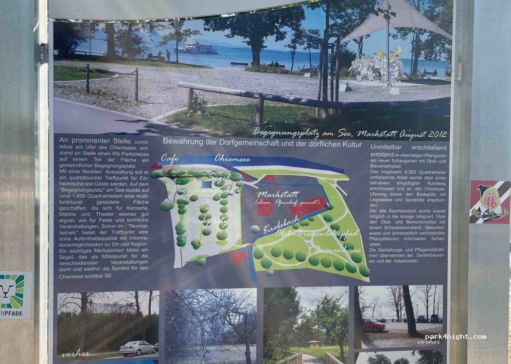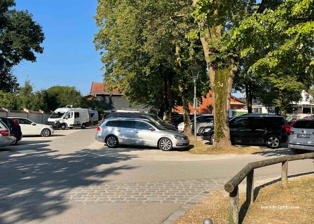 Parkplatz direkt am See (100 m) mit Blick auf den See und Badestelle. Von 8-19 Uhr gebührenpflichtig. Platz ist auch für Wohnmobile (wenn der Parkplatz nicht mit PKWs voll bestellt ist) möglich - hier kann man versuchen rechts am Rand etwas zu finden.