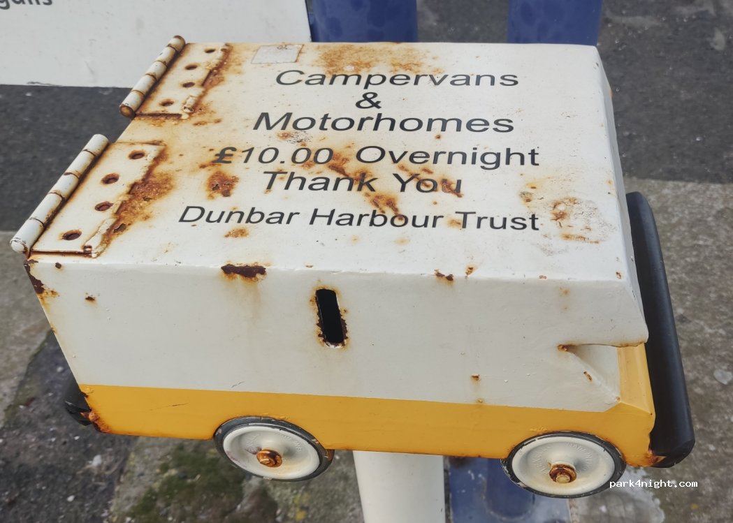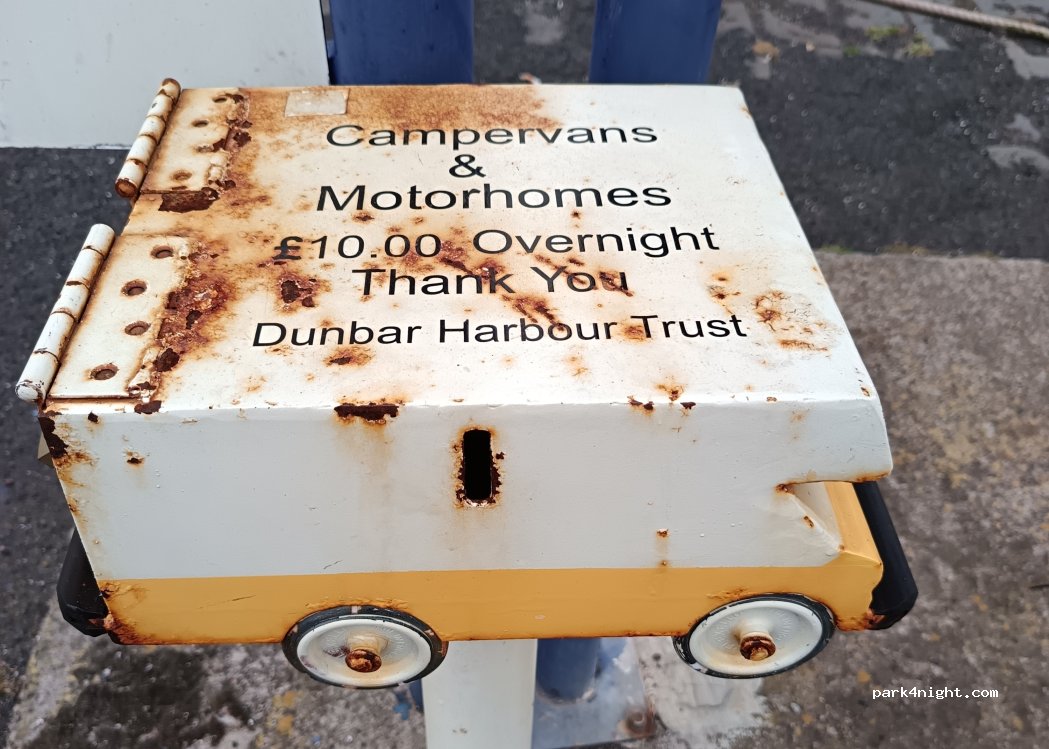 Thank you Dunbar Harbour!!! Shame more Harbour authorities don't allow the same parking. Price per night is £10 in the honesty box. Please if you use this carpark overnight do be honest to continue this service for others and potentially encourage other harbours to do the same. The money goes towards the beautiful Harbour that has lots of information boards for tourists.