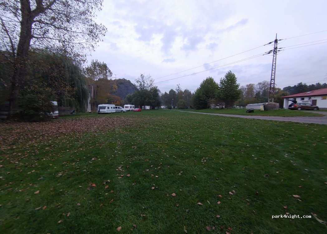 Campsite by the river, free pitch on lawn. No specific place for van or motorhome. Simple but clean facilities. Snack bar on site. Payment only in cash. The young woman at the reception speaks very good English! Passage of the access bridge limited to 7 tons.