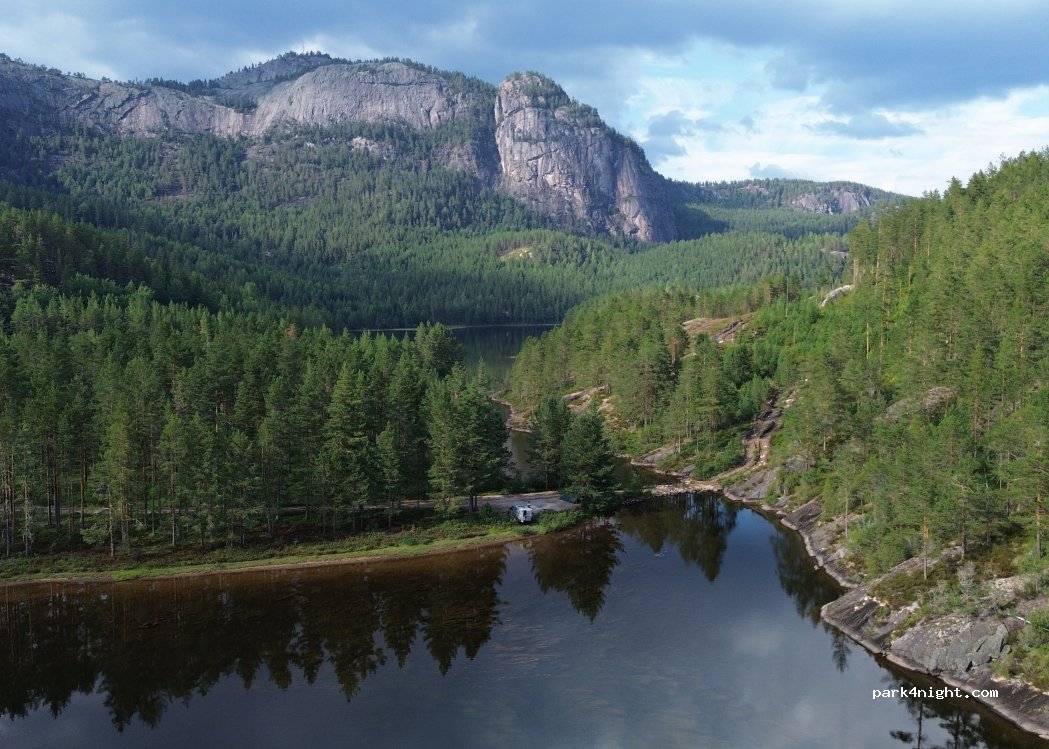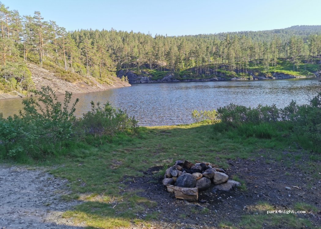 Dirt road end just 500 meters from FV352 near Giants Kettle in Nissedal. Small spot for 2 medium campers with campfire and access to the lake for canoeing or fishing. No services but totally quiet. Please take all your garbage with you when you leave to preserve this beautiful spot. Be aware that this place can get flooded with water as the water can rise quite fast, especially from March-June. 30/04-25: The gravel in the middle of the road is currently very high, and you will scrape your underbody if you follow the tracks, even in a big van. Please drive carefully and try to drive on the side of the road.