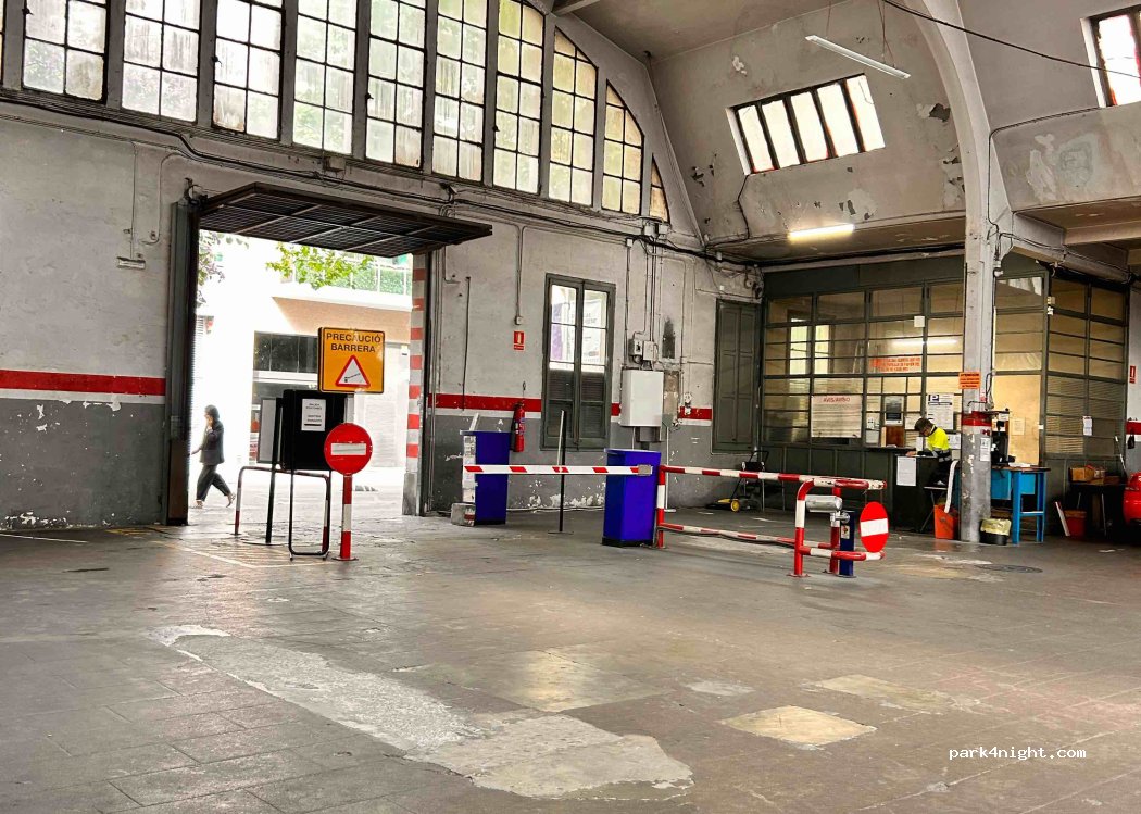 Acceso sin límite de altura ni longitud. Llegamos con una furgoneta una carpa de techo un portabicicletas (4 bicis) enganchado a la furgoneta y pudimos dejarlo todo seguro. Estacionado desde las 5:30 p.m. a las 10 a. m. del día siguiente. ¡El metro de Rocafort está al lado! Los guardias son amables y serviciales. Nos ofrecen guardar las llaves del vehículo para moverlo en caso de necesidad. Buena dirección para recordar en Barcelona.