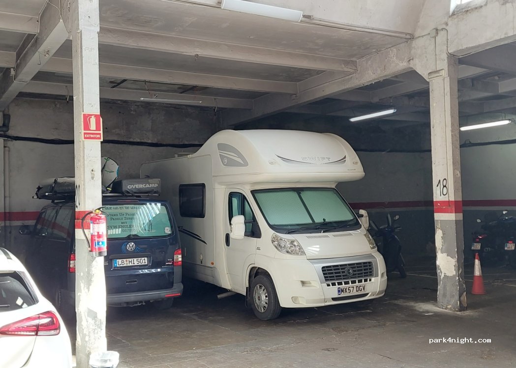 Parking hyper bien situé dans l’exeimple, 50€/24h pour un véhicule de plus de 4,5m de long. C’est le prix en ville, aucun souci de hauteur, parking gardé et rassurant. Le gardien est super sympa et ne parle qu’espagnol. Au top !