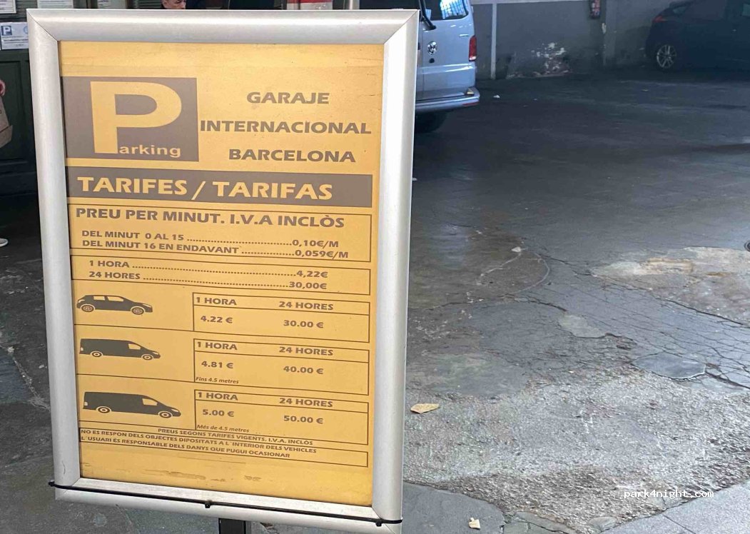 Excellent place to park to explore Barcelona- we pulled right in and they let us in with no discussion (6m long, 3m tall)- also no issues when leaving- they let us right out the entrance. 15,95€ for 4 hours. Highly recommend- as attendant on site so no worries about our van.
